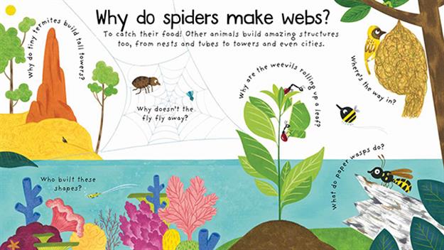 A playful, informative look at why animals (and a few plants) are the way they are and do what they do, broken into 5 topics - camouflage, food storage, protection, movement, construction - plus a general spread. Quirky scenes, simple text, and friendly flaps answer lots of pressing questions.